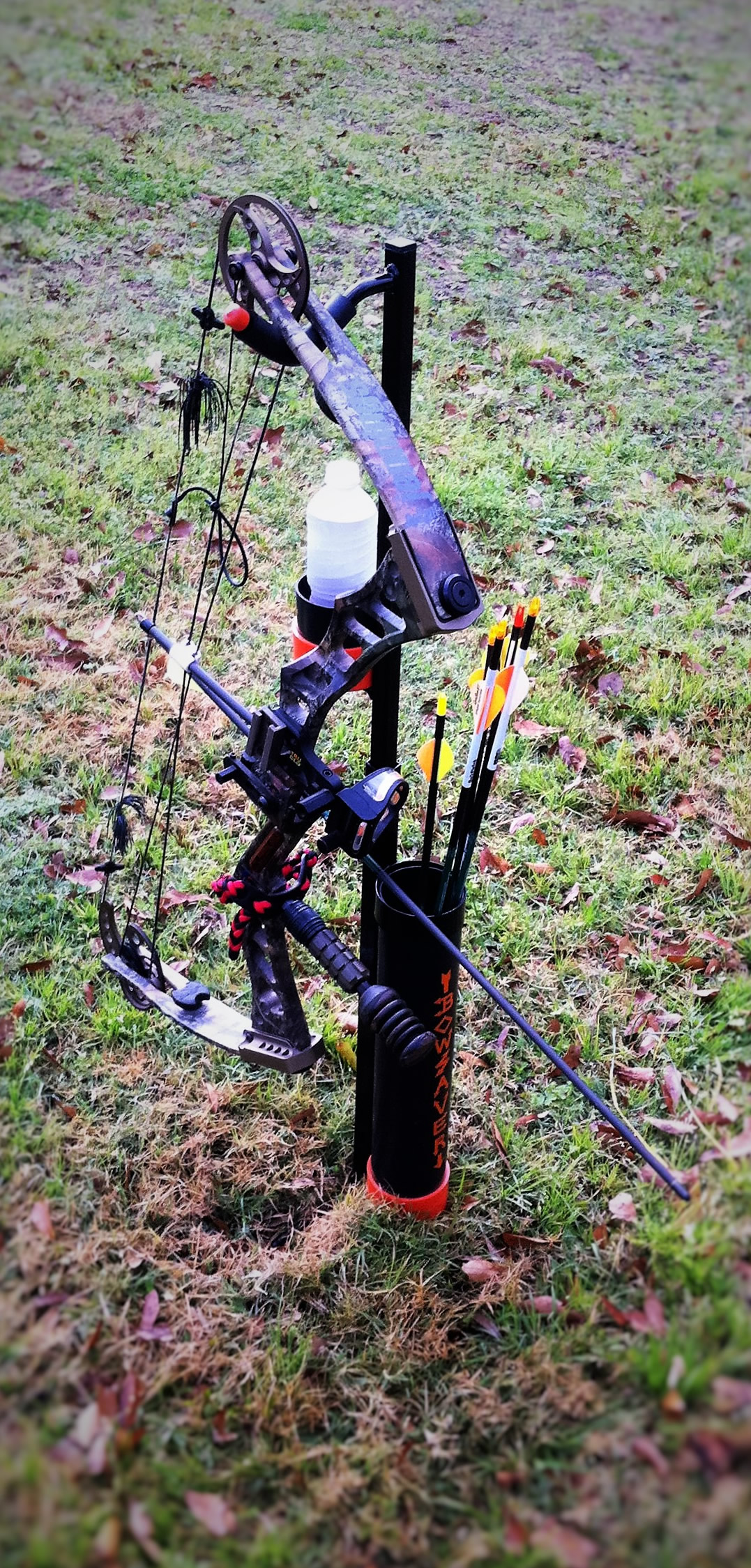 Bowsaver has expanded their quality built bow hanger product line. We wanted to bring a solid "stick in the ground" version of our exceptional hanger. Finally a strong, well built hanger for your  "on the go" practice range is available today. It is built from the same all welded, steel construction as the original Bowsaver. It is built to last a lifetime. Complete with padded hanger, tough coat finish, built in quiver and cup holder.